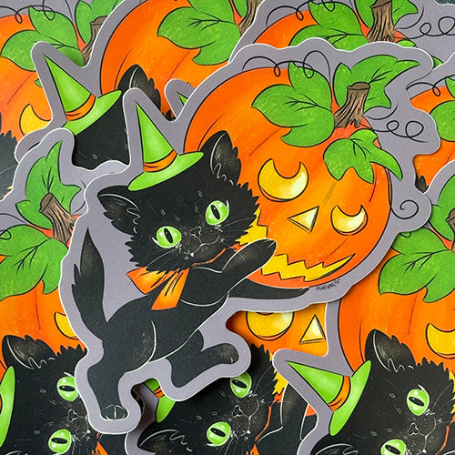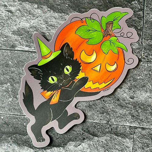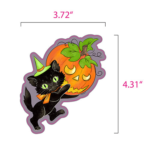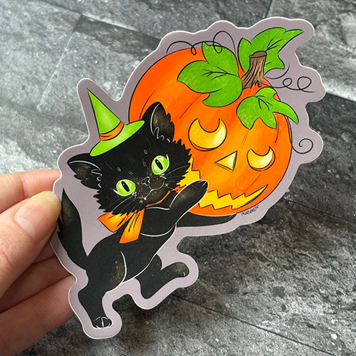 Help me pick the biggest pumpkin! Bring back the nostalgia with this original Pumpkin patch kitten design by artist Ash Evans. This 4 inch durable matte vinyl sticker is perfect for adding a vintage Halloween touch to your collection. Made in the USA, it’s a fun and lasting way to showcase your spooky style!